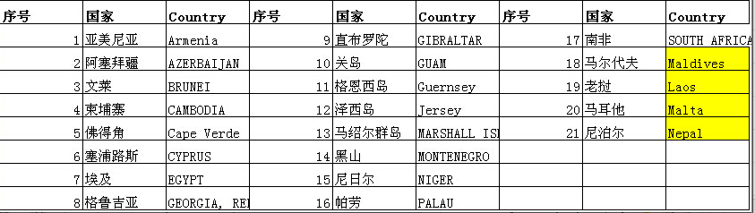 接香港Fedex通知,下述国家(黄色标记部分为新增的国家)均不接受寄运所有锂电池及附带锂电池之货物(即PI965、966、967、968、969、970)。
